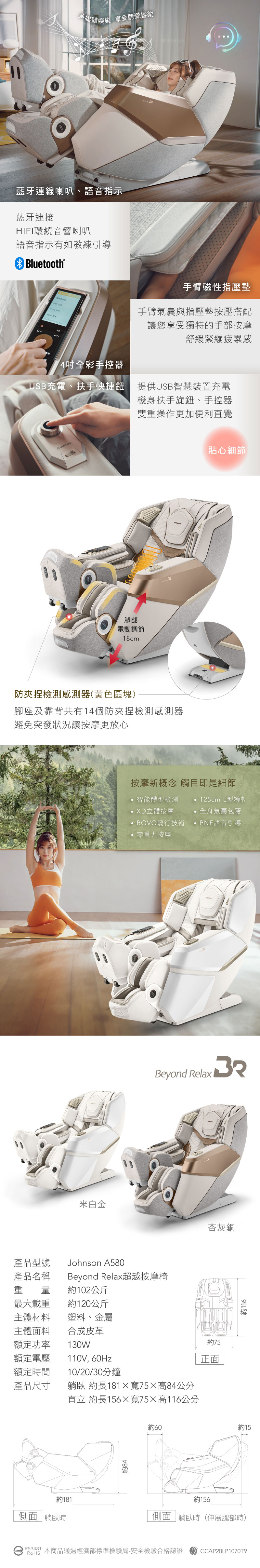 .藍牙連線喇叭、手臂磁性指壓墊、4吋全彩手控器、USB充電、扶手快捷鈕