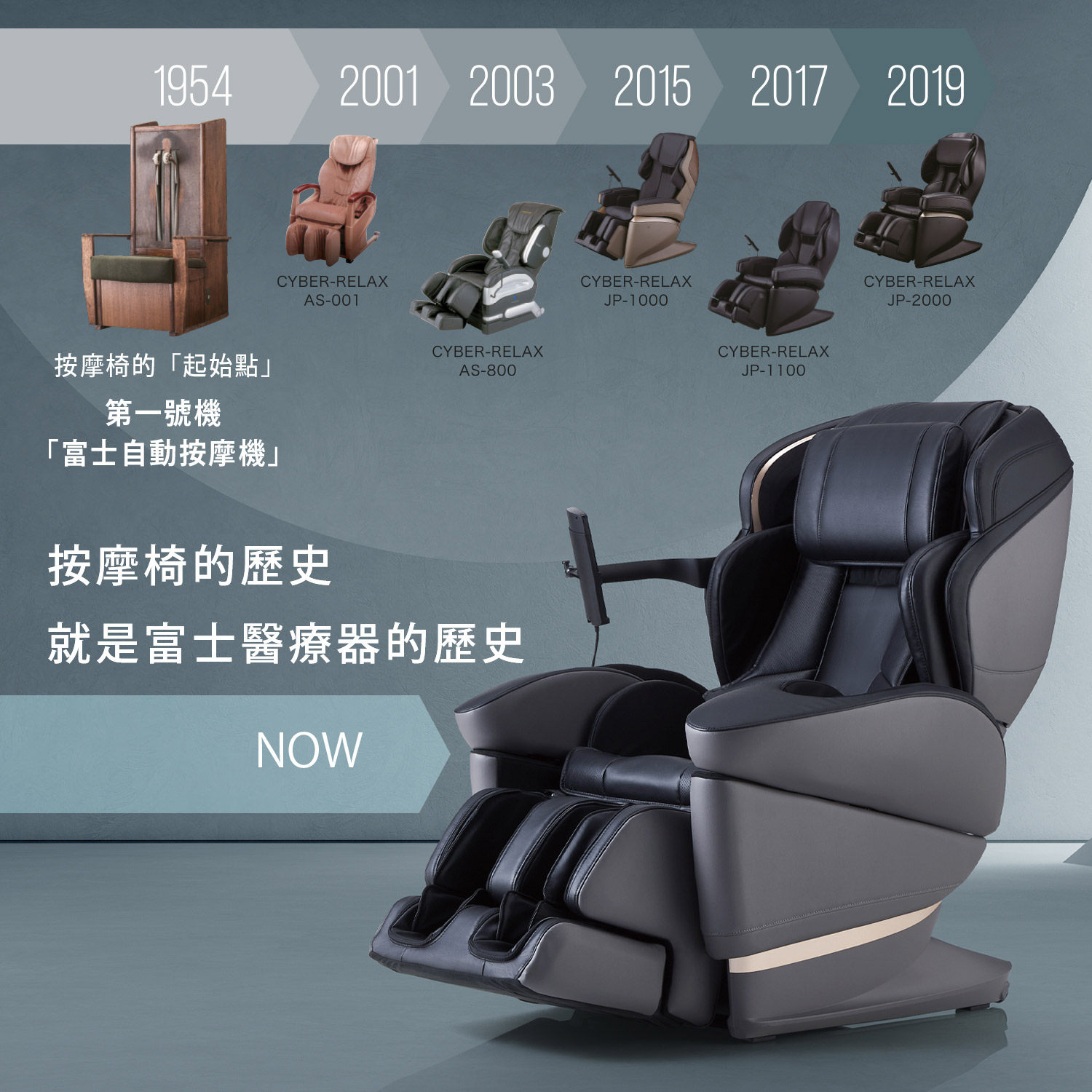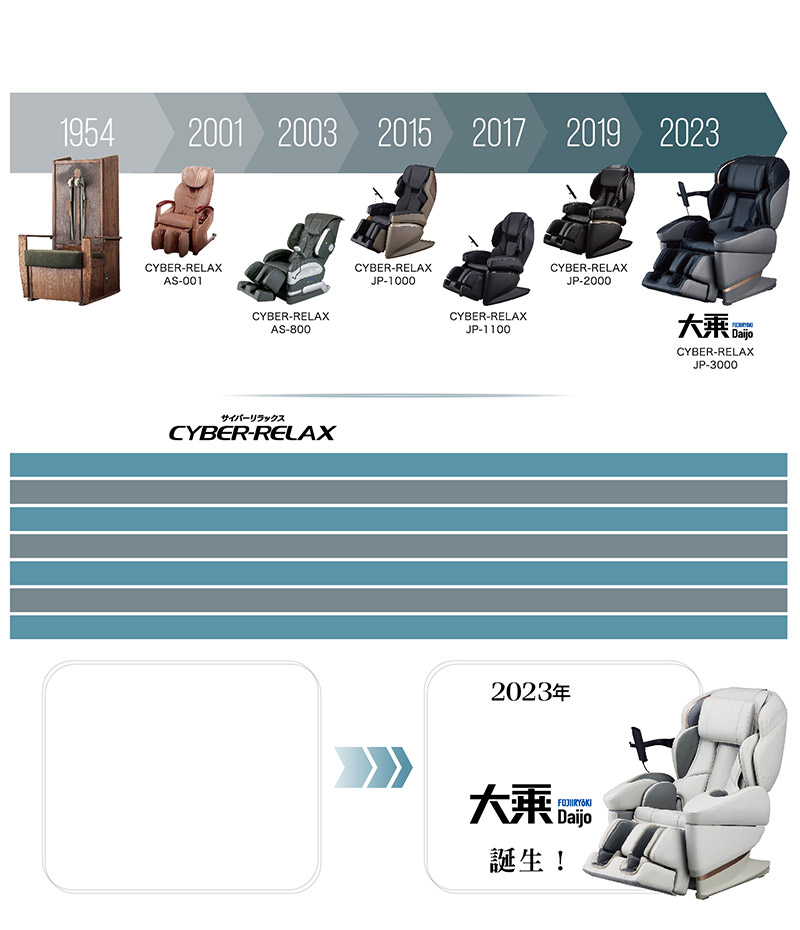 富士醫療器,按摩椅的世界先驅。 我們的技術從1954年以來歷經時間不斷進化。