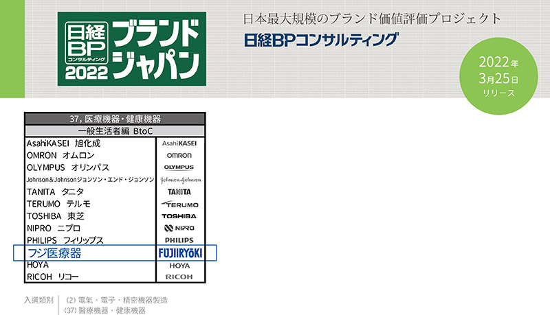 調查內容分為BtoB(企業人士評價)及BtoC(消費者評價)兩部份。在消費者評價中,富士醫療器FUJIIRYOKI獲選入千大品牌之一。
