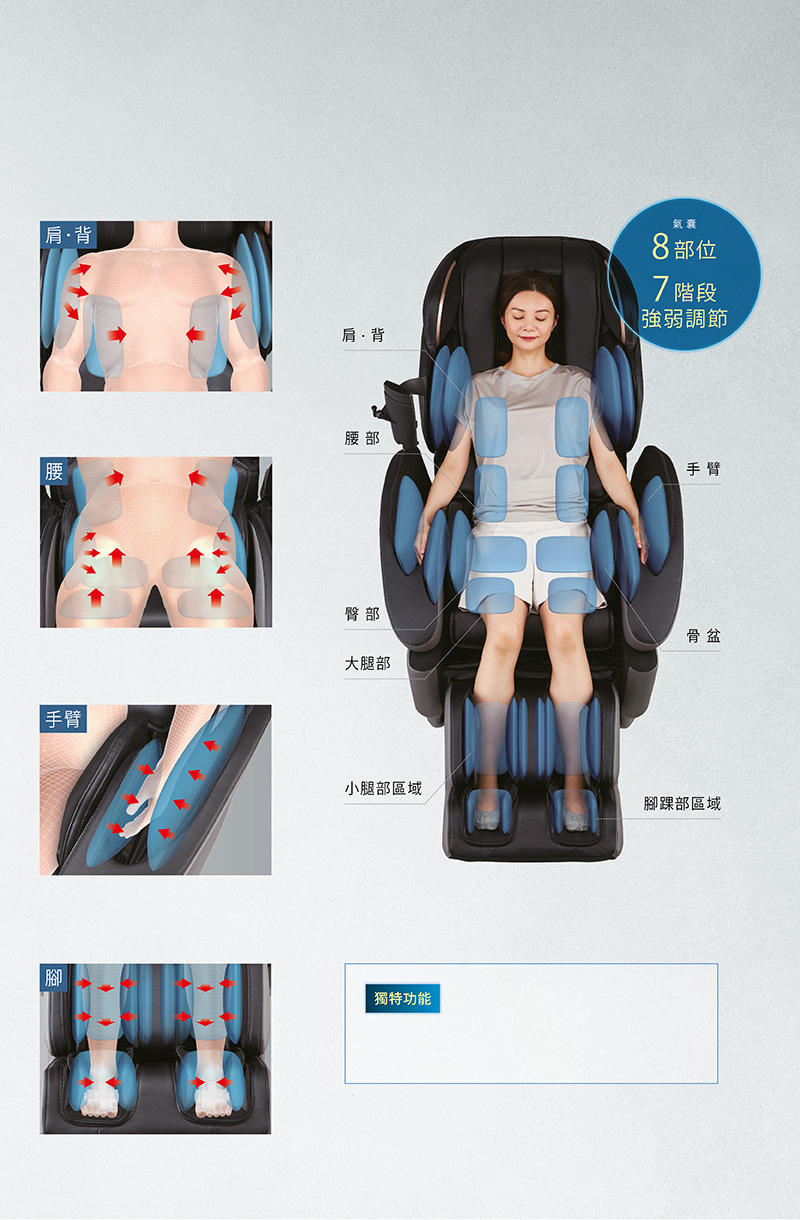 .氣壓按摩,7階段強弱調整全身8個部位