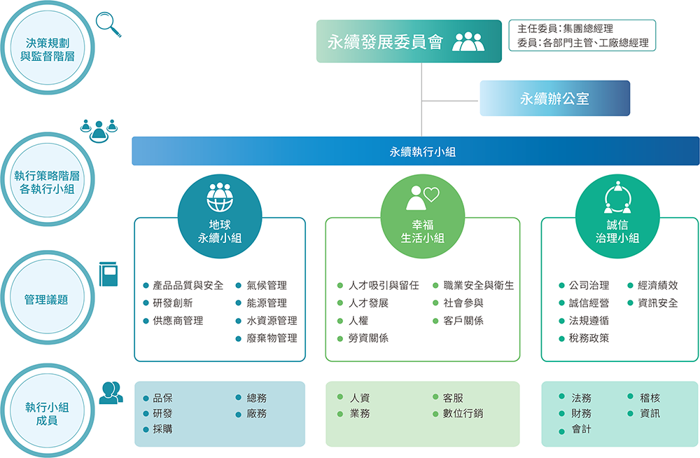 喬山作為全球知名的運動健身器材公司,致力於打造優質安全的工作環境,創造促進全人類健康生活的科技產業,我們自2022 年起建立永續發展(ESG) 委員會,由本公司董事兼總經理羅光廷擔任委員會主席,及各部門主管擔任委員會成員,定期監督永續執行成效,恪守公司治理與永續發展規範。此外,我們在永續發展委員會下,按照ESG 三大永續發展面,分別設立地球永續、幸福生活及誠信治理三個永續執行小組,並由各項永續議題相關單位主管組成,規劃與推動達成永續目標,且每年定期匯報成果至永續發展委員會,並呈報至董事會。