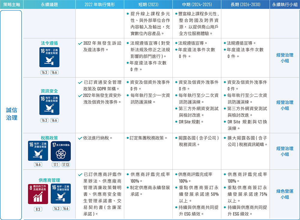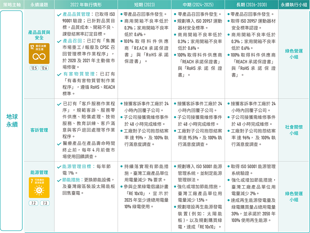 喬山為了實踐「地球永續」、「幸福生活」及「誠信治理」三大永續策略,已召集永續執行小組訂定各項永續議題的短中長期永續目標。我們將透過執行永續行動計畫來達成目標,並定期檢視執行進度及匯報予永續發展委員會,進行監督檢核及策略調整。